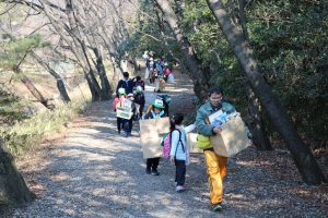 集合場所から元気いっぱいの子どもたち♪やる気マンマンの勢いそのままに、森の中までひみつ基地の材料抱えて大移動。