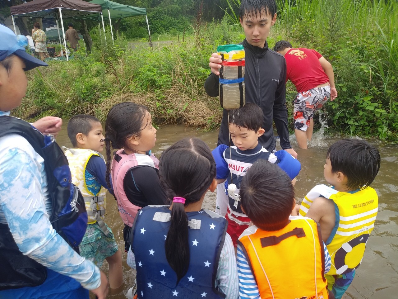 飛び込み以外にも、ライフジャケットをフル活用して浮いてみたり、柱のところでみんなで遊んだり、川の生き物をタモで捕まえたり、それぞれがやりたい事を見つけ全力で取り組んで楽しんでいました。