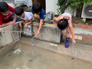 午後は前日に用意していた、ザリガニをプールに放流してザリガニ釣りを行いました。