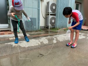 バケツで水をかけあったり、袋に水を溜めて投げ合ったり、
