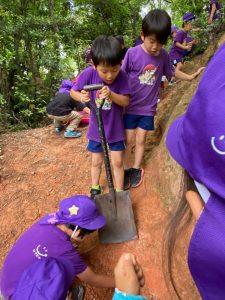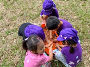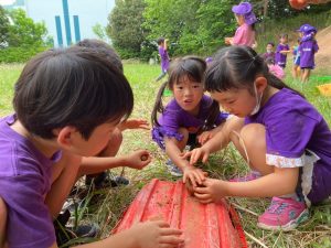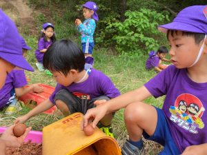 どろだんごづくりは、デコボコ山で粘土をみんなで採るところから始めました。