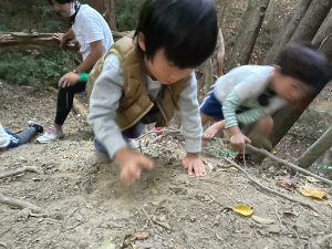 さて、崖のぼりはロープも使って本格的にチャレンジしてきました。かなり急な斜面もありましたが、ロープや自然の根っこ、木などをうまくつかみ、上手にのぼってくれました。GEKKOやスタンツでは、崖のぼりをすることで、チャレンジ精神を刺激したり、体感の使い方やバランス感覚をしっかりと鍛えることができると思っています。