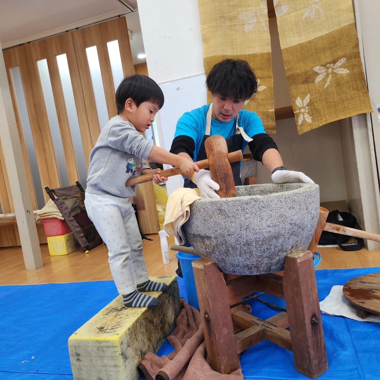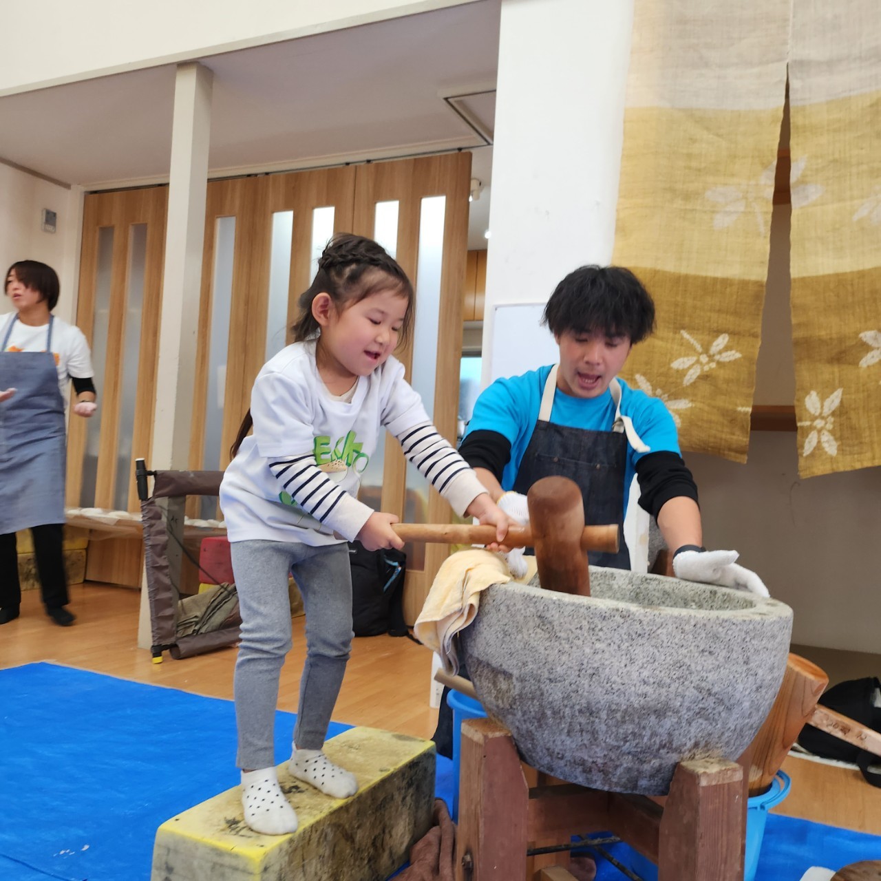 初めての子に対して杵の使い方やお餅つきのやり方を伝えました。