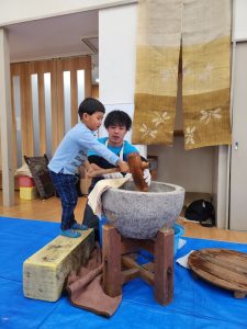 今日は子ども達も楽しみにしていた、【お餅つき】そして1日目と2日目に作成した【お正月遊び】で遊びたいと思います。