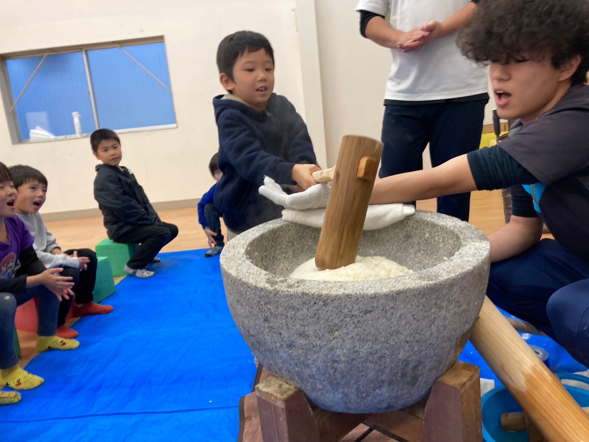 こま回しの練習を終えた後はみんなお待ちかねの『お餅つき』です。