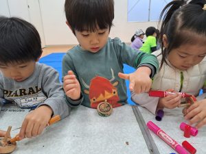 散歩を楽しんだ後は、部屋に戻って独楽を楽しみました。年少さんは、自分の手で回す、独楽。無地の独楽にマジックを使って自由に彩色しました。色を塗っては試しに回して、色の変化を楽しみました。この遊びが凄く気に入った様で、年少さんはとても集中して楽しんでいました。
