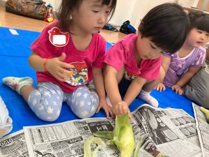 今回は、今が旬の食材「とうもろこし」を使った活動。