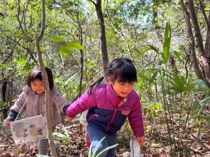 寒い日は、森の中で遊ぶととても暖かいんですよ!先日もものすごい風が吹いていて寒い日だったのに、たくさん動くオレンジさんの中には、「先生、暑い!」と言って,