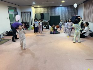広いホールで音楽に合わせて身体を動かしたり、風船運びリレーやじゃんけん列車などのレクリエーションで遊んだりと大盛り上がり。