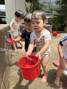 バケツにすくって遊ぶお友だちや水がかかって嬉しそうに遊ぶお友だち、