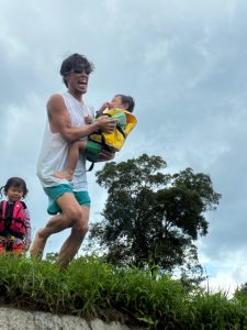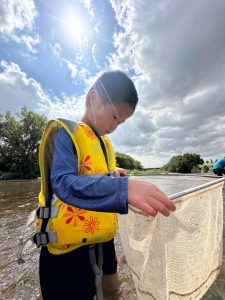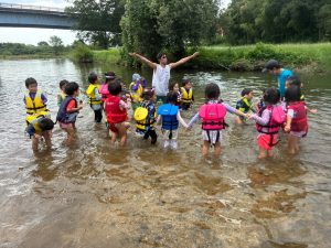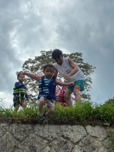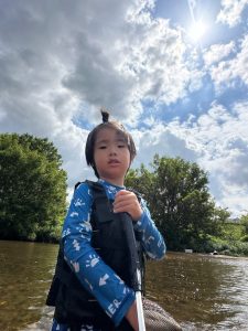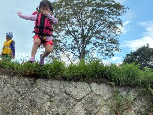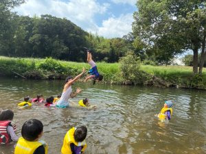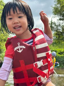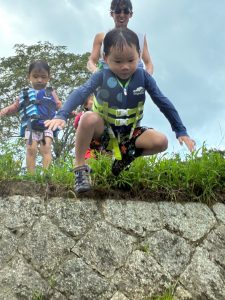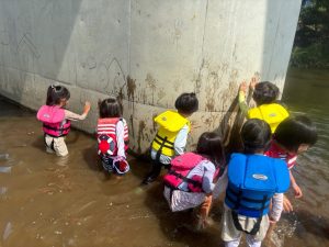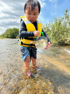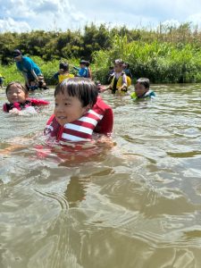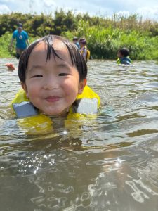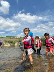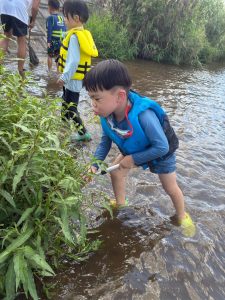 前回は子ども達のふくらはぎ程の浅瀬だったのに、この日は、子ども達の腰ぐらいの深さになっていたりで、川の地形は毎回違う事を気付いたお友達もチラホラ。