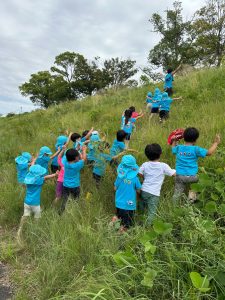 草で手を切るといけないのでバンザイして登ったのですが、足腰と体幹が強くなってきたのか、登れてしまう空さんにびっくり仰天でした。