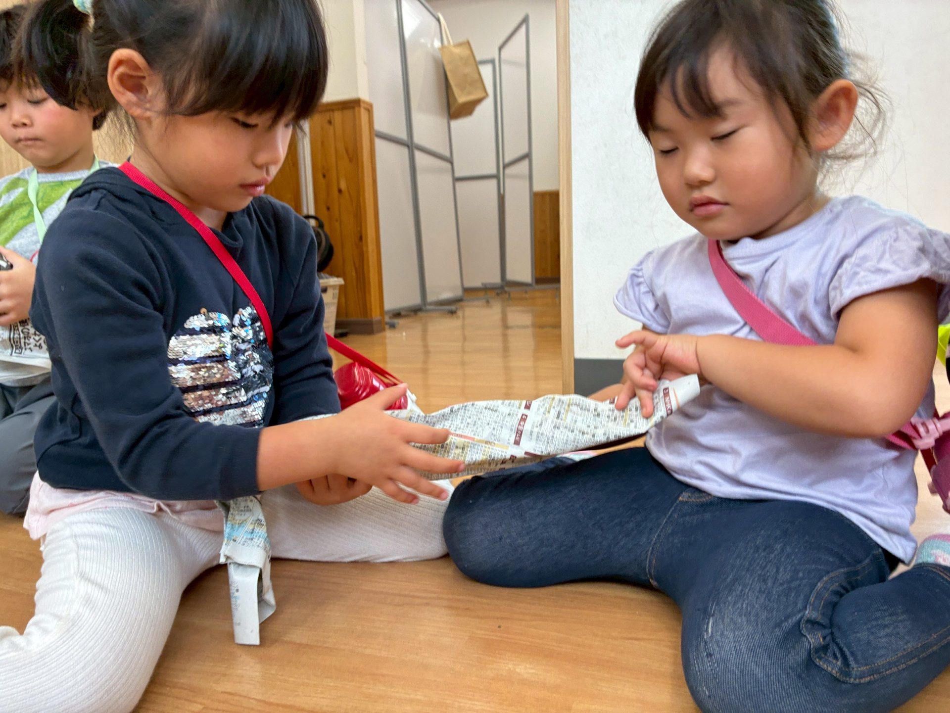 みんなで挑戦することは➀サツマイモを新聞で包むこと、