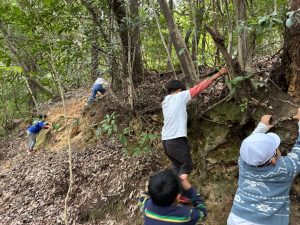 おたまの池に着くまでに、崖のぼりをして、体をぽかぽかに。