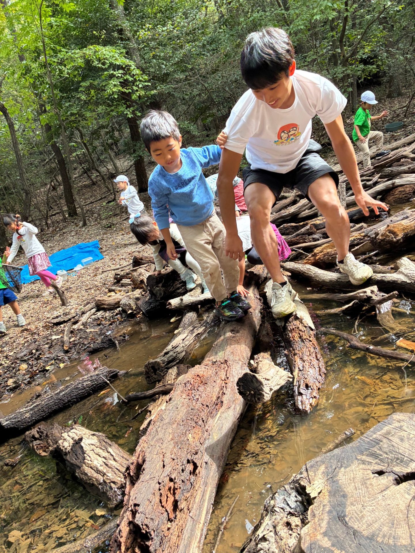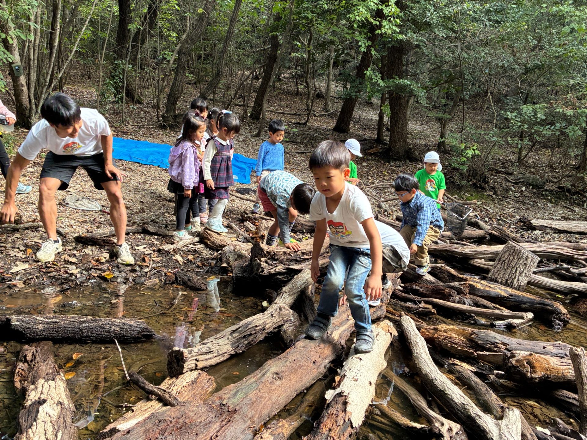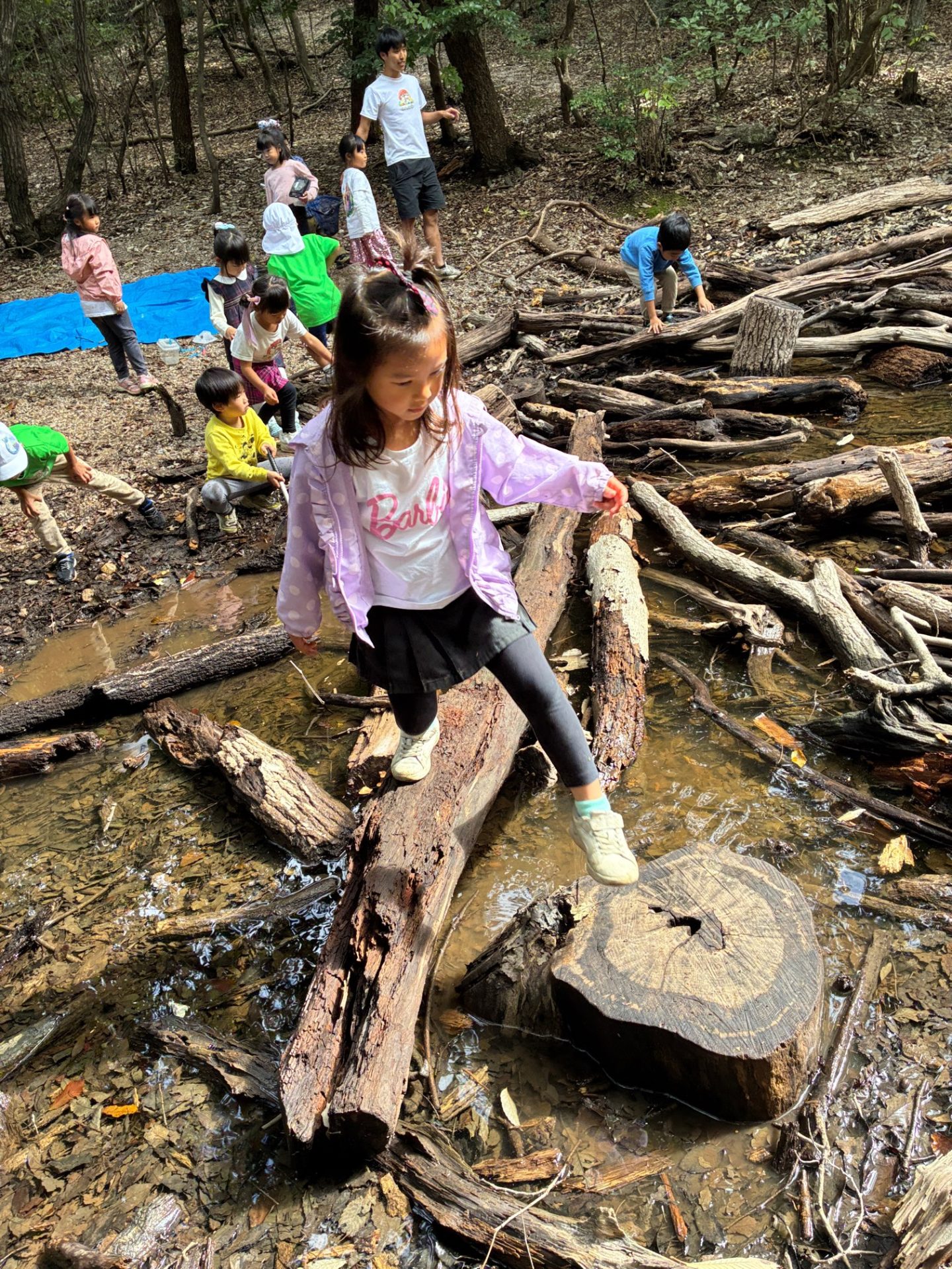 落ちてるでっかい木で「一本橋」もやりました。