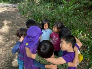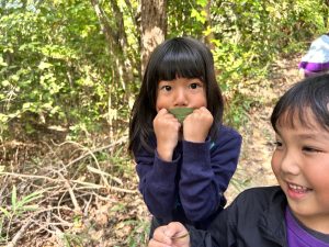 最高の崖スポットを探す為に出かけた探検では、春に覚えた“草笛”や“キジ笛”を試したり、葉っぱを使って目を隠して「ばあー!」自然の中で思いっきり遊びながら山道を進みました🍃