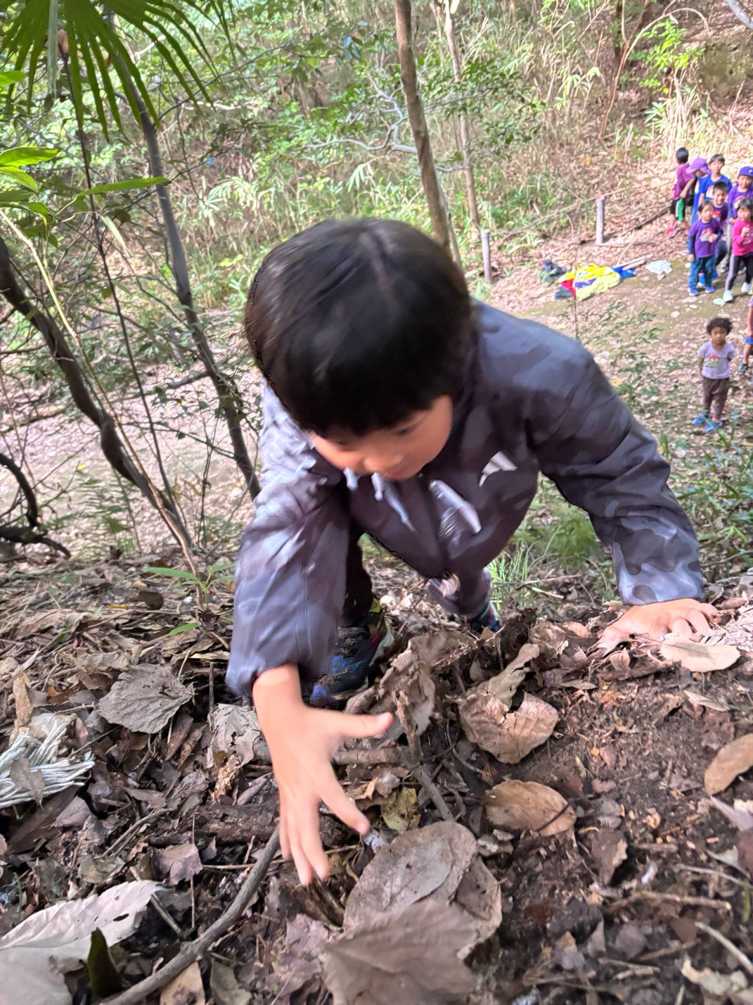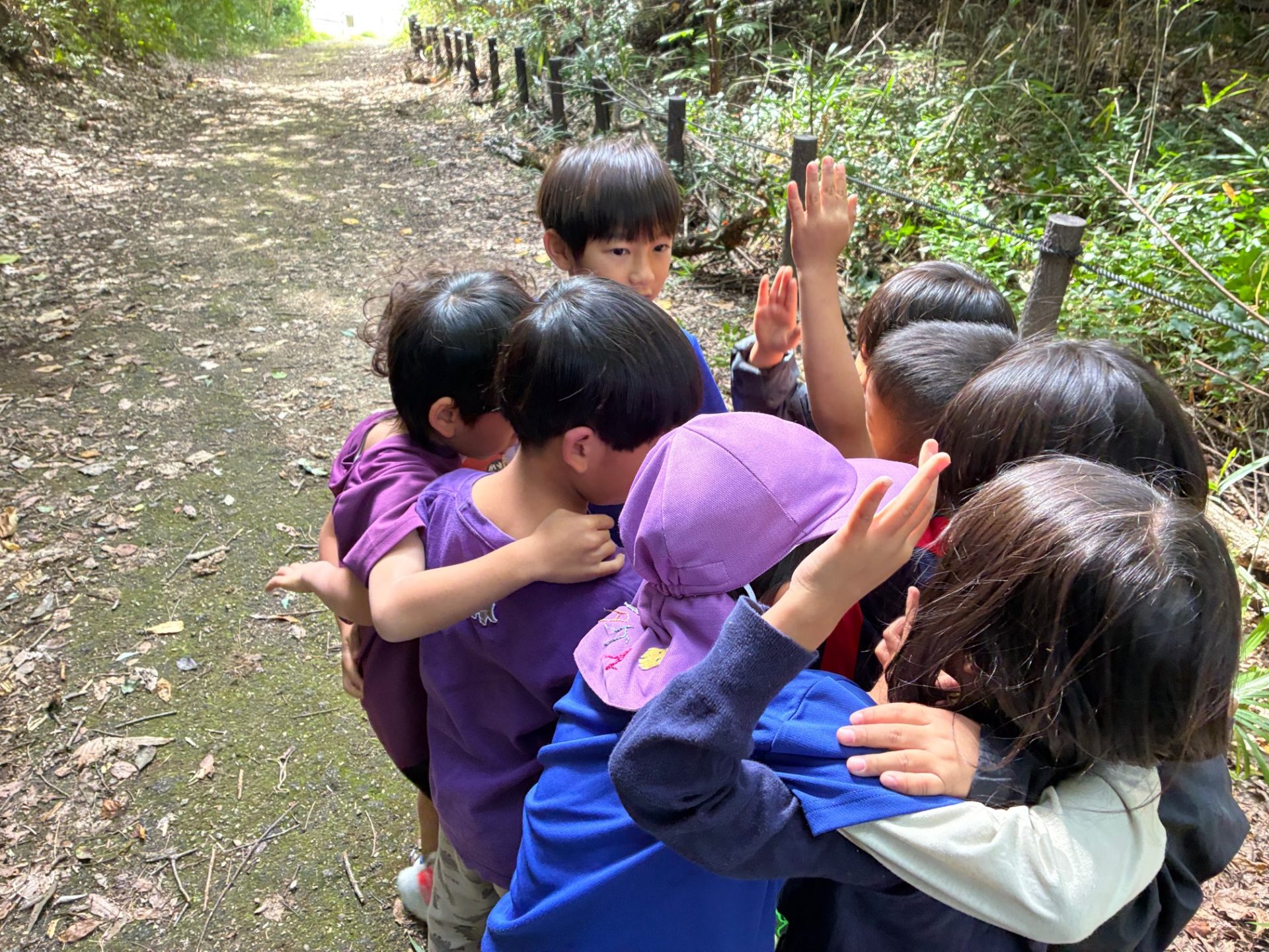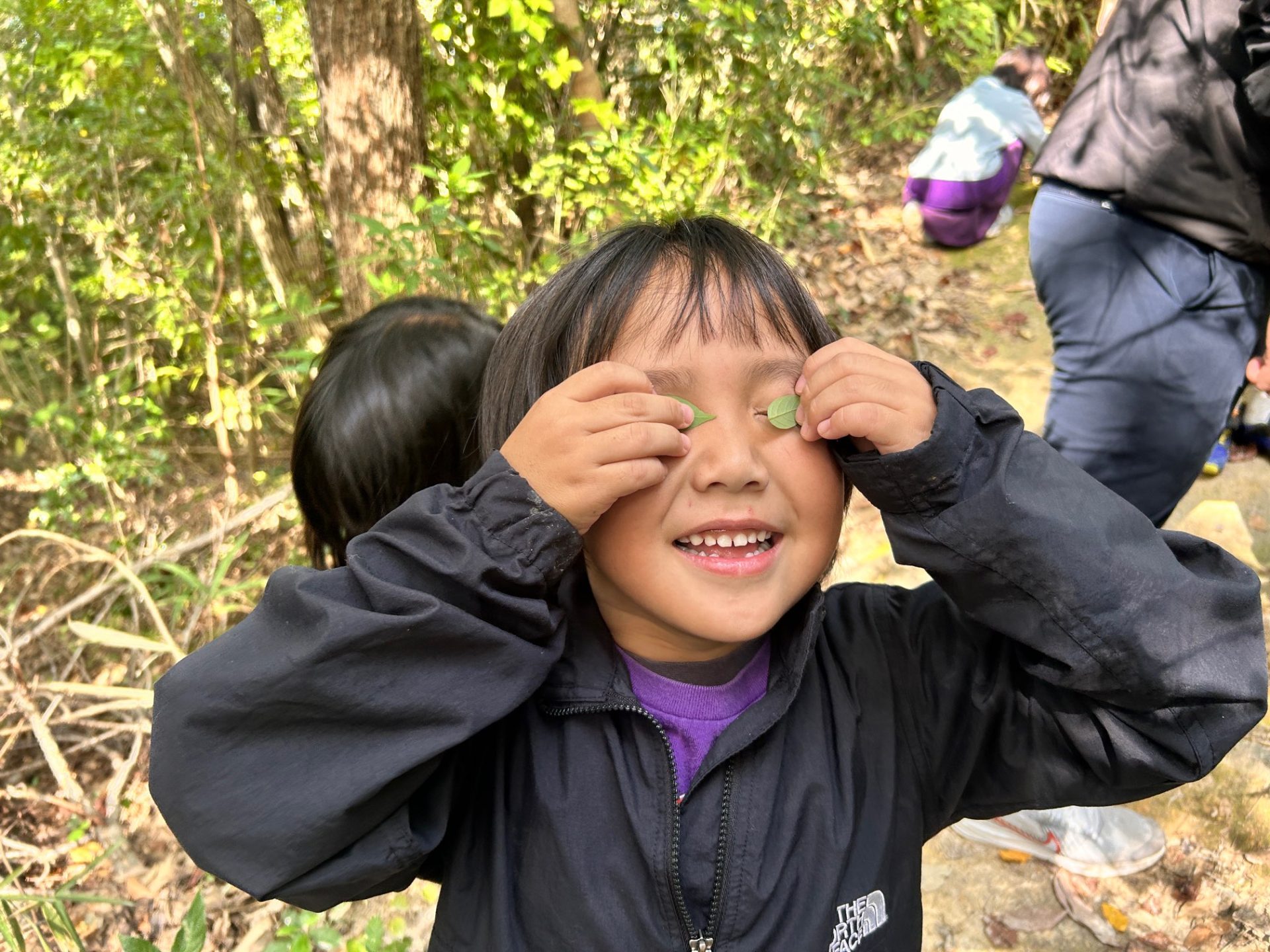 最高の崖スポットを探す為に出かけた探検では、春に覚えた“草笛”や“キジ笛”を試したり、葉っぱを使って目を隠して「ばあー!」自然の中で思いっきり遊びながら山道を進みました🍃