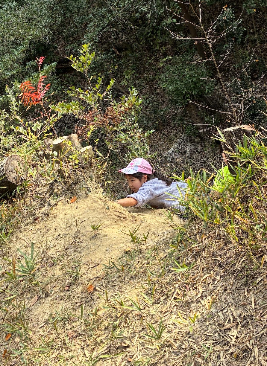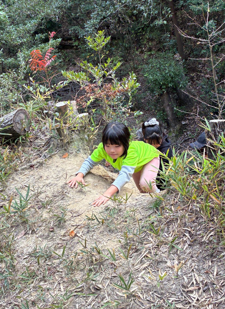 北高上緑地のがけは斜面が急で、つかまるところや足場の工夫が必要なレベルの高いがけです。