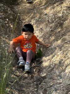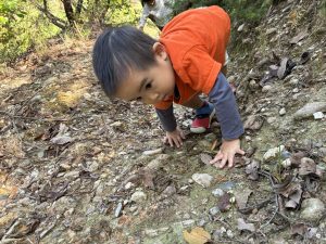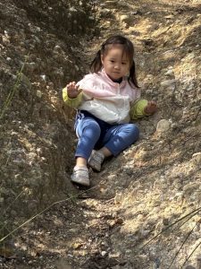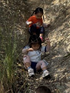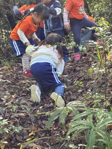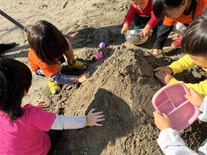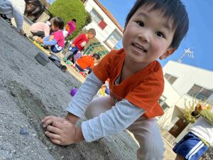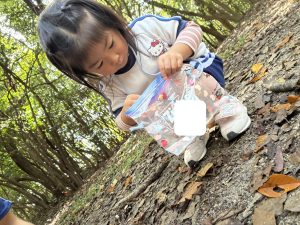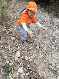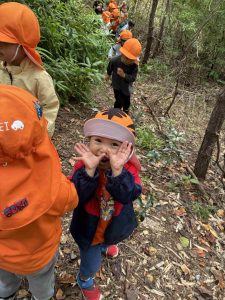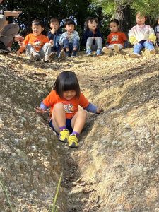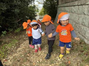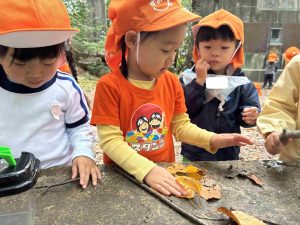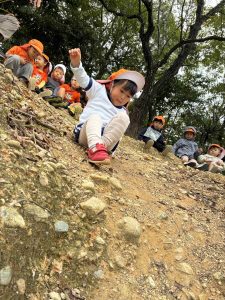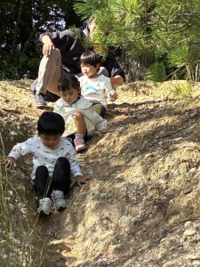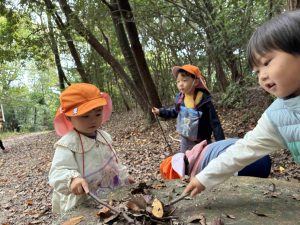 2歳児クラスでは、本格的に「山」での活動に入り、制作では「お正月制作」と、冬の足音も聞こえてくるようです。
