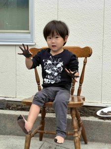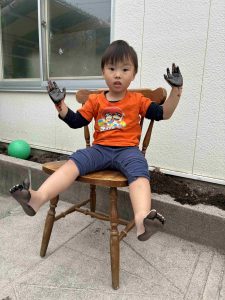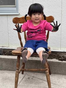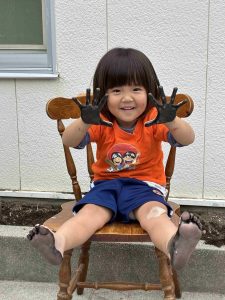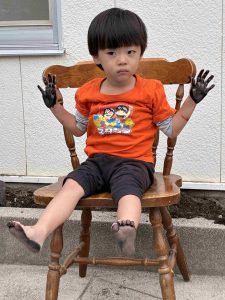 手や足をしっかりと真っ黒に染めて、園庭でペタペタと「お正月制作」。