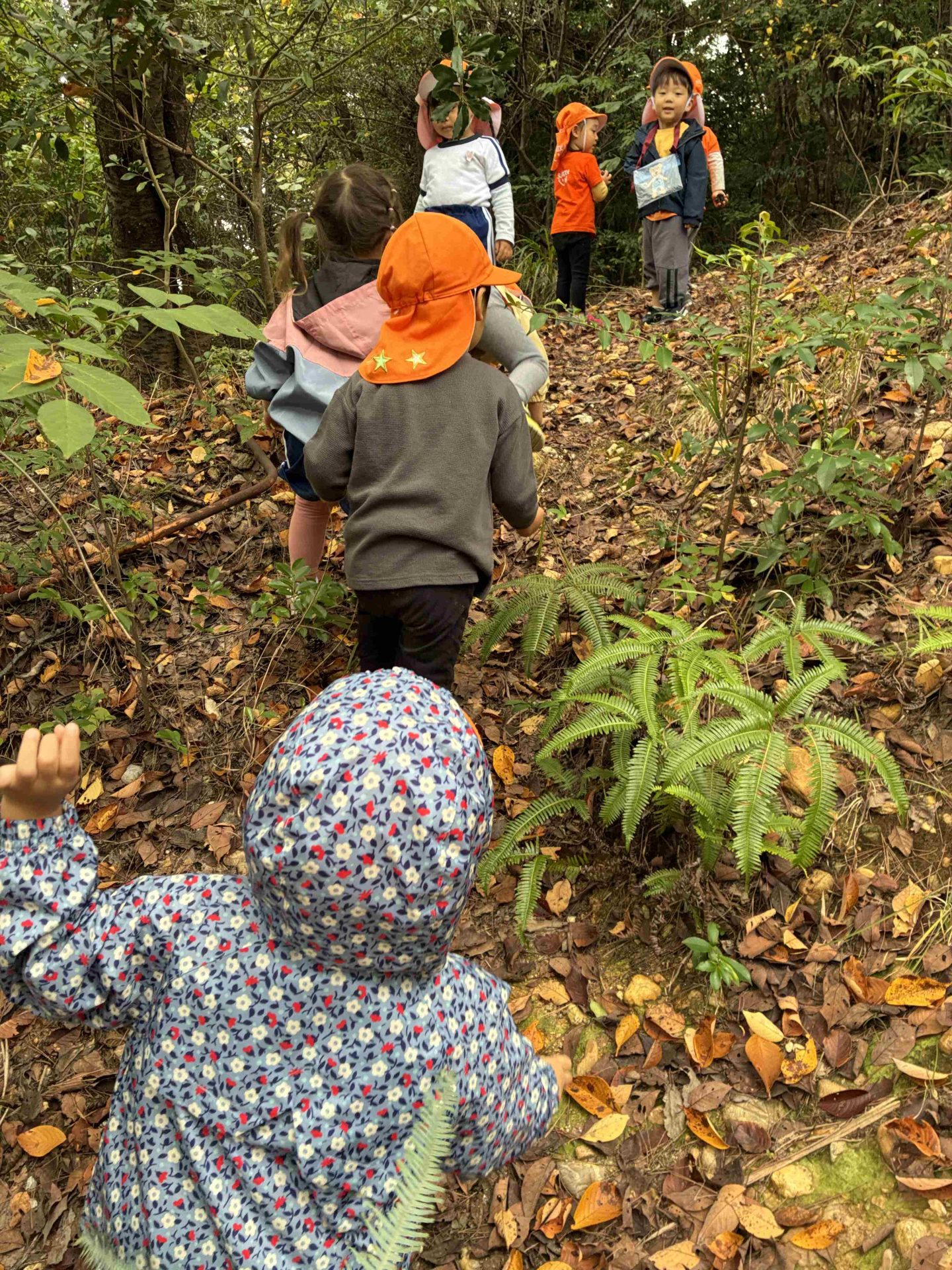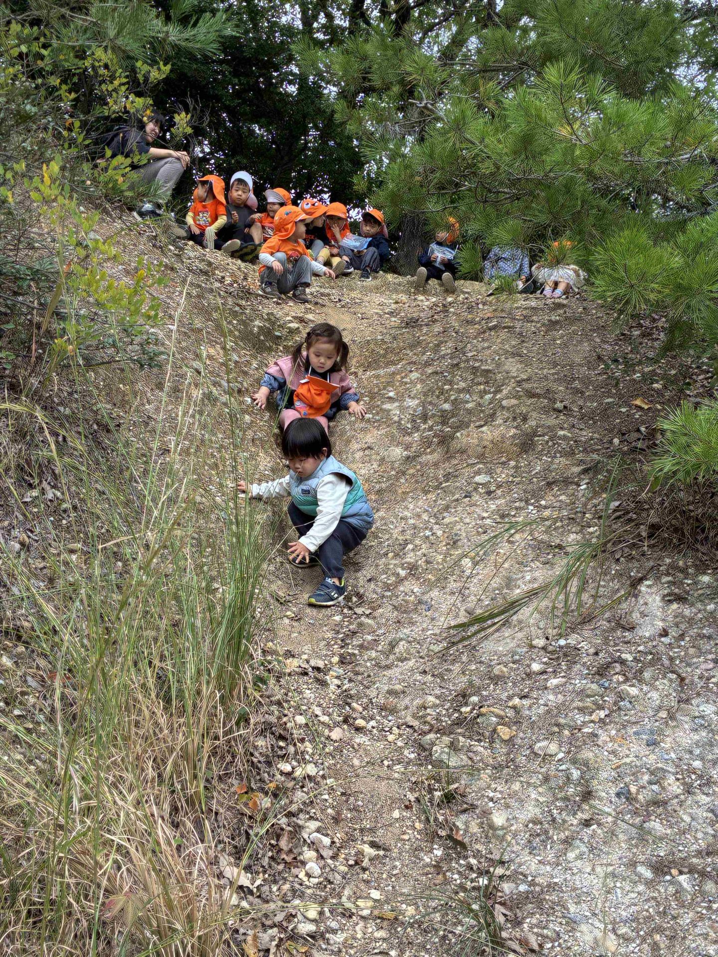 2歳児クラスでは、本格的に「山」での活動に入り、制作では「お正月制作」と、冬の足音も聞こえてくるようです。