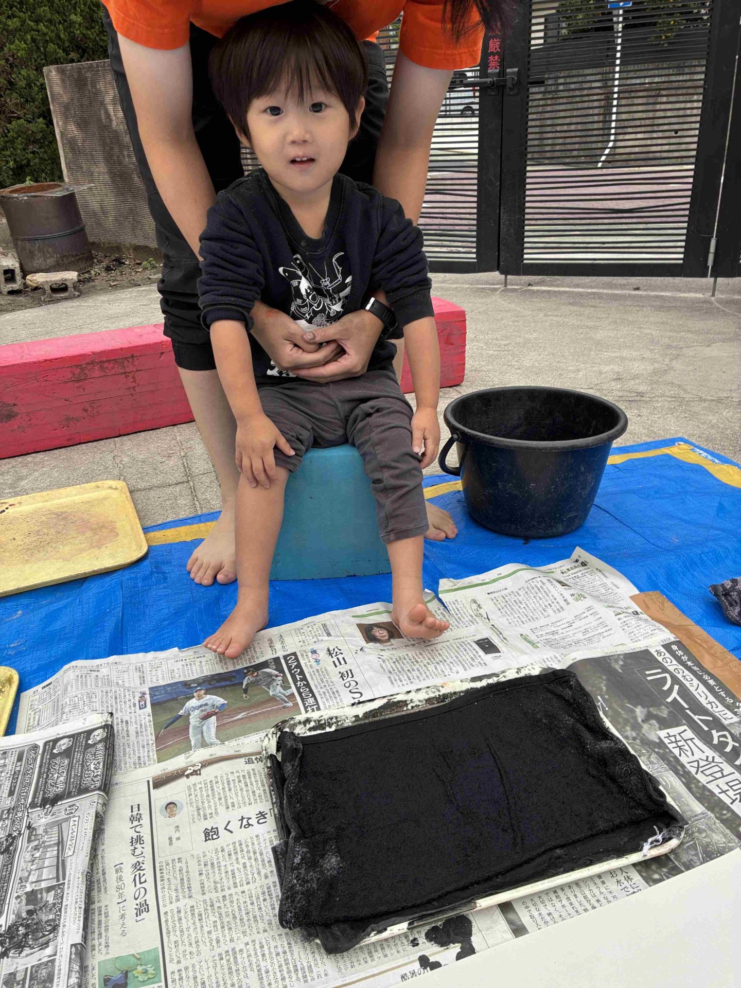 手や足をしっかりと真っ黒に染めて、園庭でペタペタと「お正月制作」。
