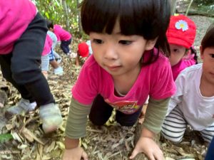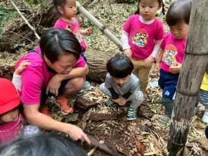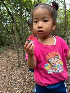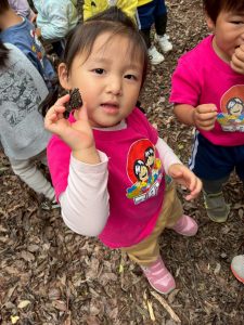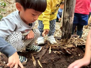 見つけた幼虫に目を輝かせて「ぼくもさわる」、「わたしもみたい!」と言ってくれました。