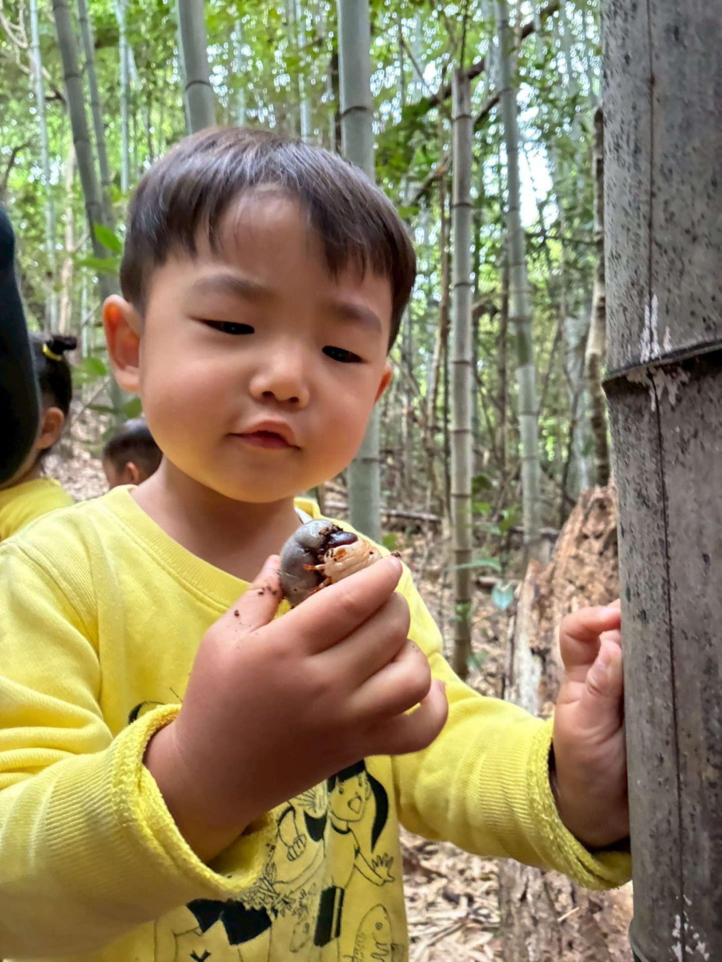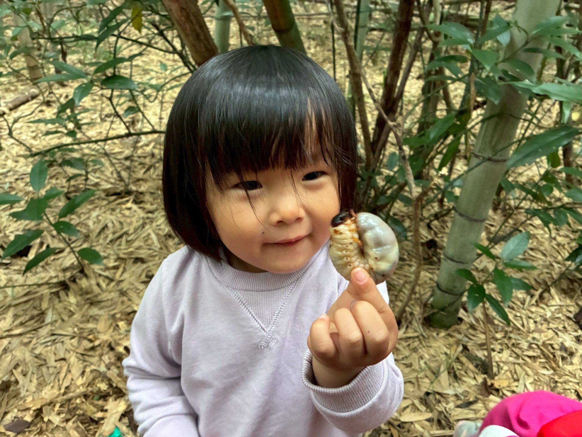 見つけた幼虫に目を輝かせて「ぼくもさわる」、「わたしもみたい!」と言ってくれました。