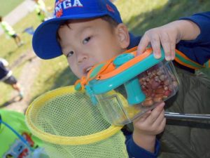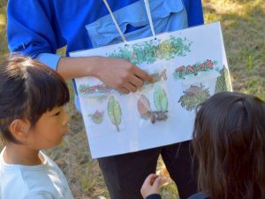 見つけたドングリは、先生達が持っている図鑑に入れます。