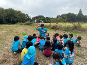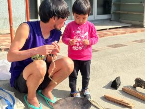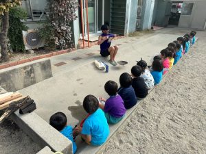 今回は、火おこしの準備を子ども達にお話しし、やどうぼうしでキャンプマスターになった、空さん先生がお手本を見せてくれました。