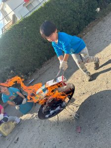 麻紐ほぐして、割り箸割って小さく折って、ひらぺったい薪を3枚置いて準備ができたら、先生を呼んでマッチで火を付けました。