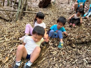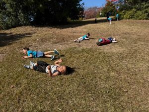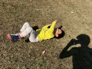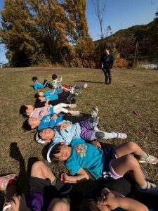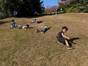 薄着で芝生に寝転がる子どもたち、、、可愛らしいですね。
