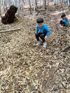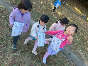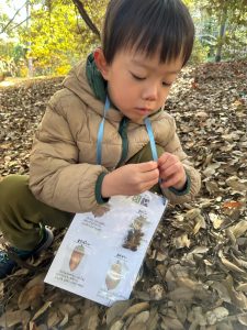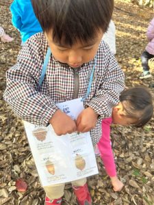 早速公園に着いてからは、どんぐり図鑑をぶら下げてどんぐり探し。