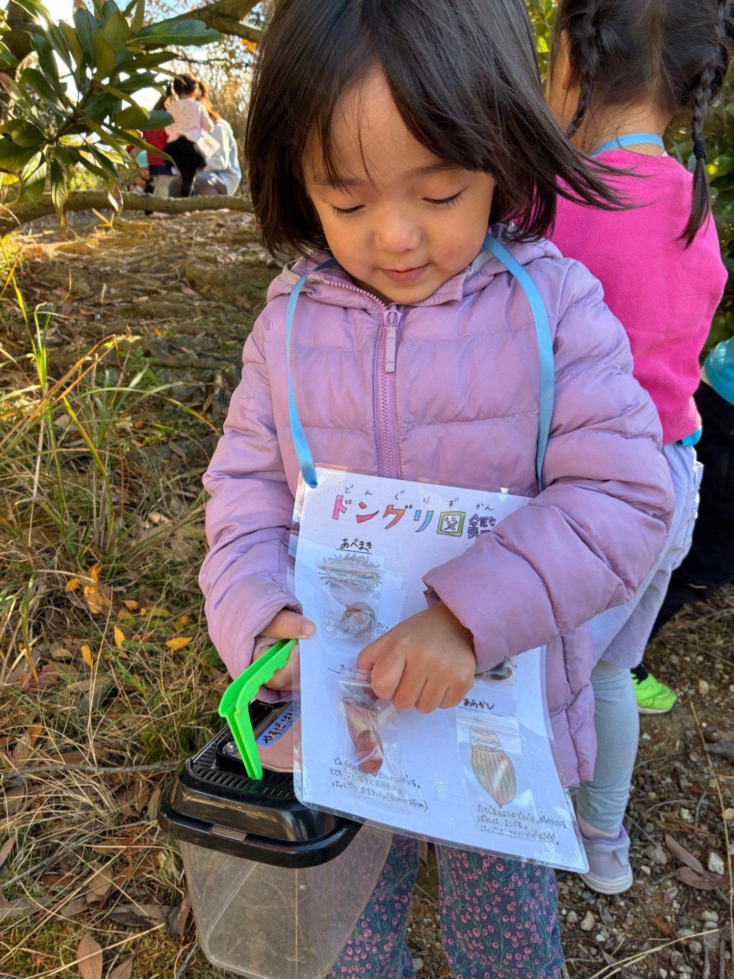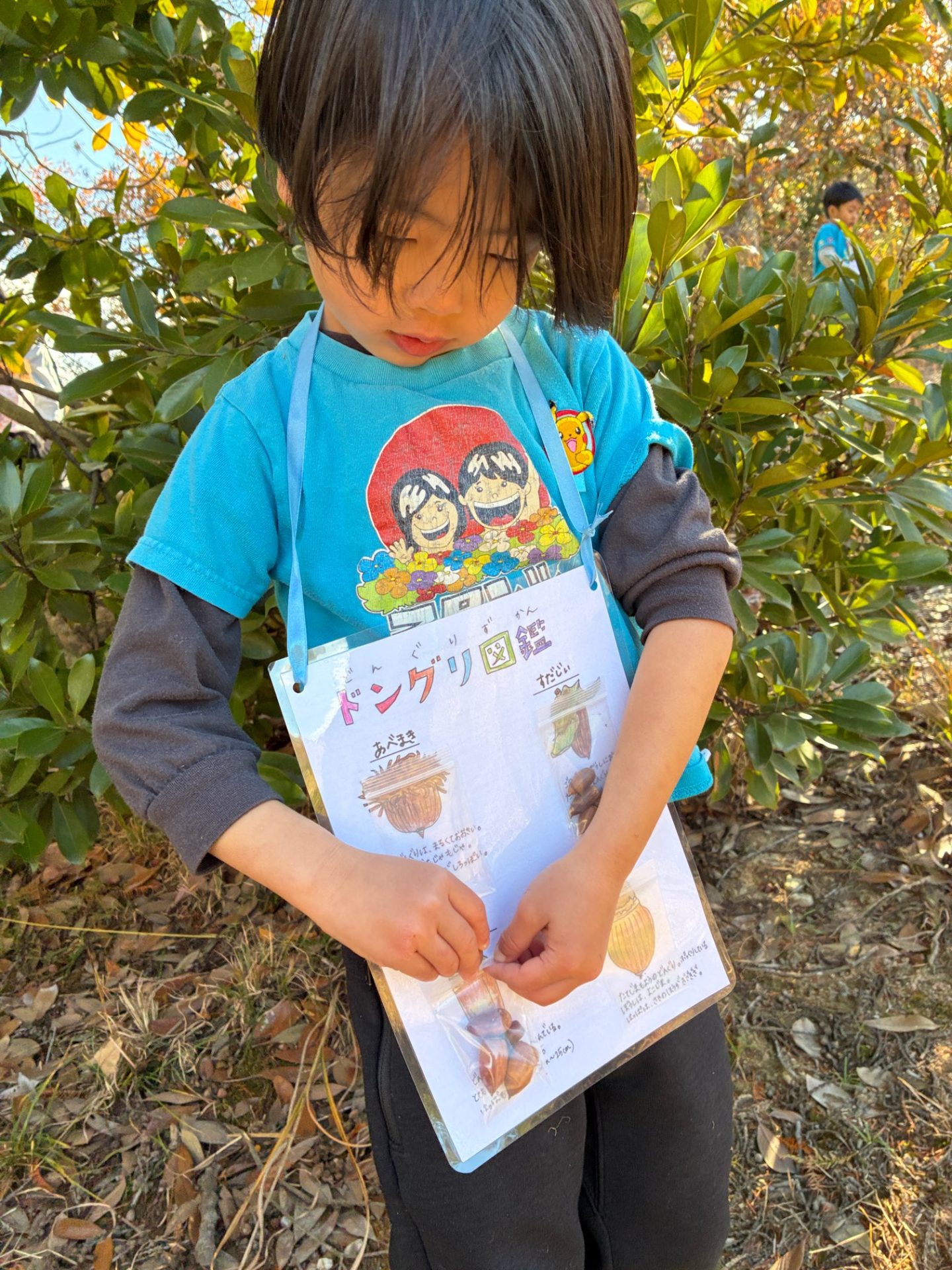 早速公園に着いてからは、どんぐり図鑑をぶら下げてどんぐり探し。