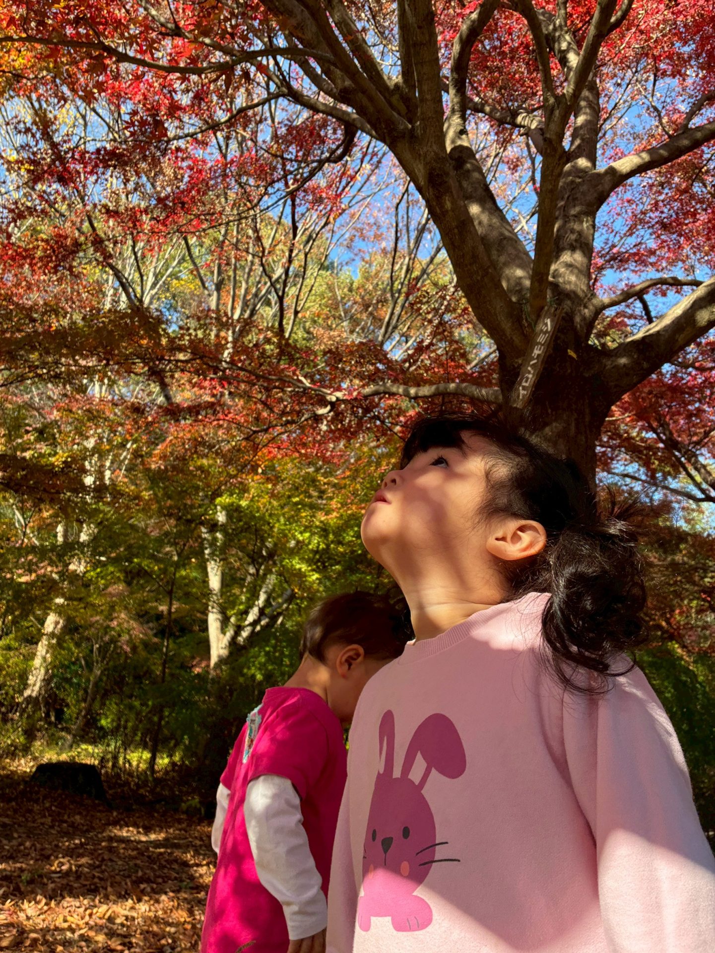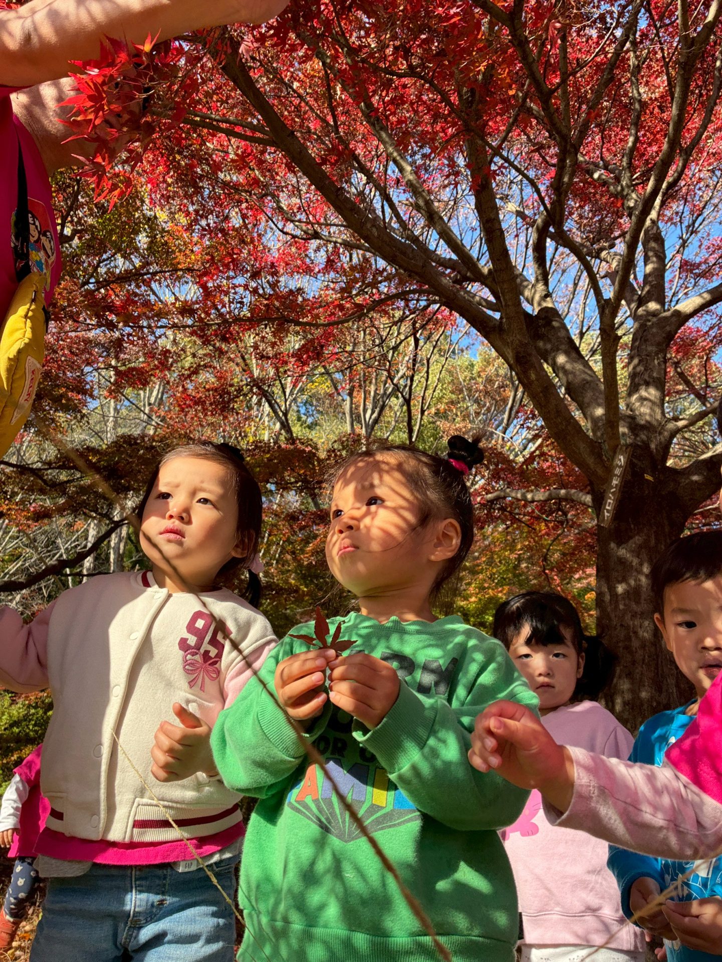 赤さんのみんなも葉っぱを眺めて「赤くなってるね!」と言って、