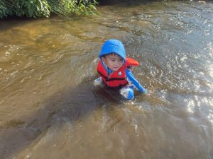 川の流れに身を任せて流れてみたり、お友だちと手をつないで流れてみたり、