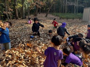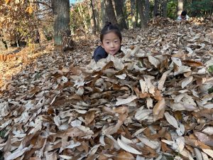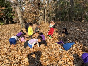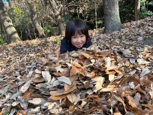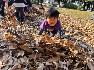 思いきり飛び込んで遊んだり、落ち葉の中を泳ぐように進んでみたりと、全身で落ち葉遊びを楽しみました。