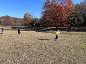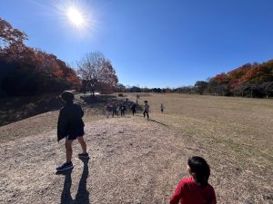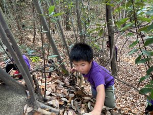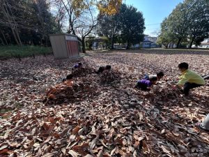猪高緑地に降り積もった落ち葉を、みんなの身長くらいの高さになるまで集めました。前が見えなくなるほどの大量の落ち葉を、両手いっぱいに抱えたり、落ちている木の枝をブルドーザーのように使ったりしながら、力を合わせて集めていきます。