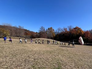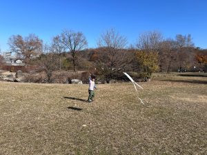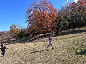 全長約170cmほどの大きな凧を、みんなで力を合わせて引っ張り、走り回りましたが……この日はなかなか風が吹かず、思うようには飛びませんでした。