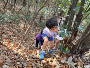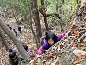 何度も同じ場所を登って登りやすい道を見つけたり、お友だちと競い合ったり、声をかけ合いながら協力して登る姿が見られました。