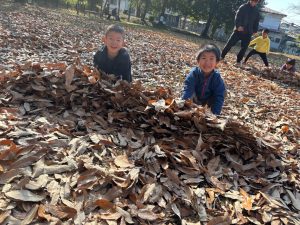 みんなで集めた落ち葉は、ふっかふかでとっても柔らか!