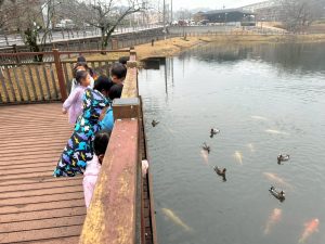 急な斜面を登ってみたり、池のカモさんにご挨拶したり