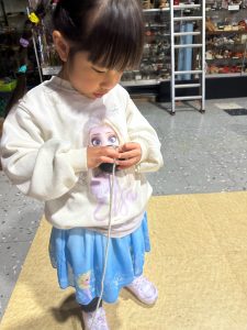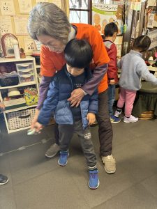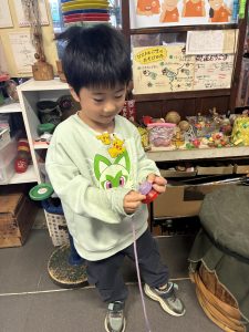 どのおもちゃも手先を器用に使って遊ぶおもちゃ。そして、根気よくやらなくてはできないおもちゃ。できた時の喜びはひとしおですね。この「できた!」を大切に、今日プレゼントした「独楽」も楽しんでくれたらとっても嬉しいです。
