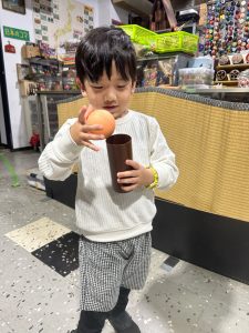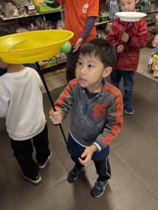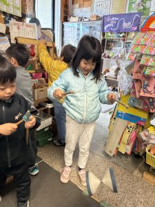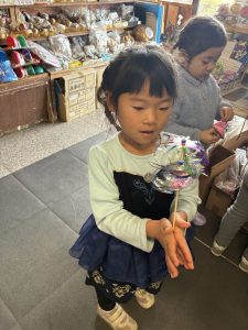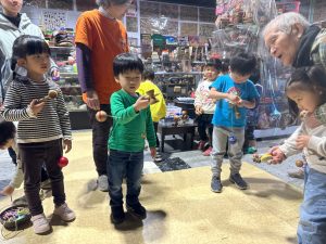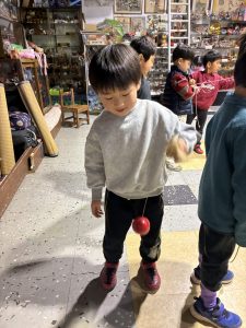 他にも、「けん玉」や「棚からぼたもち」、「皿回し」など普段遊んだ事のない、日本の伝統のおもちゃで遊びました。