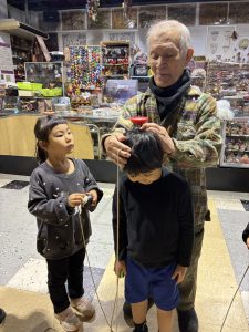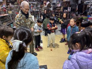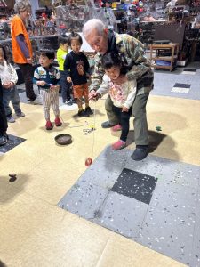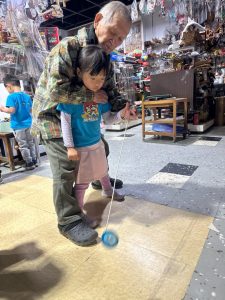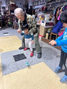 ここには、博物館の館長さんの「独楽のおっちゃん(藤田さん)」が独楽の紐の巻き方から投げ方までとてもわかりやすく指導してくださいます。