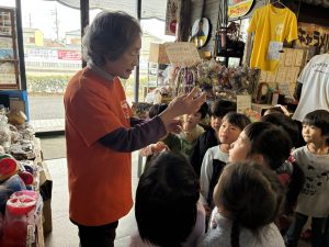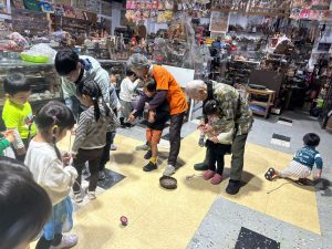 おっちゃんやおばちゃんの独楽の技も見せていただき、子ども達の「やりたい!」気持ちが高まりました。