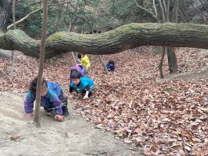 『レベル1』 2歳児さんが登る崖。空さんには簡単だったようです。木の根っこを使い、上手に登ります。