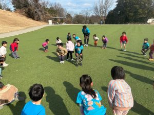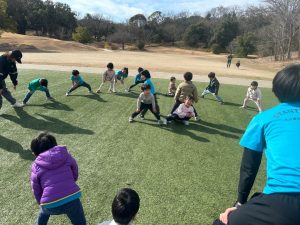 準備運動では、みんなで輪になって、前でお手本の空さん先生が入り行いました。