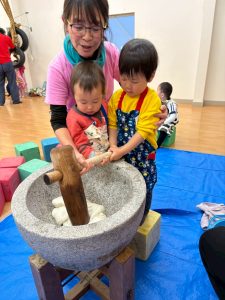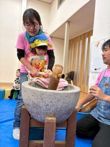餅米パワーをチャージした後は、いよいよおもちつき!自分の背丈ほどある大きな臼(うす)や、重たい杵(きね)を一生懸命に操り、「よいしょー!」と力強くつくことができました。