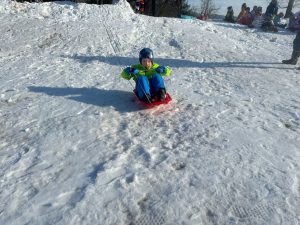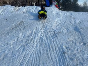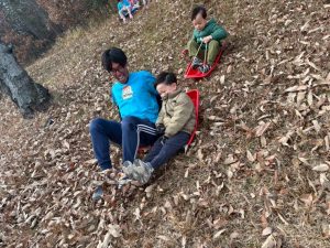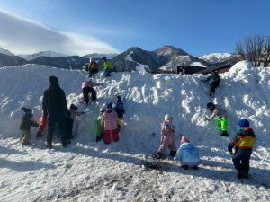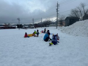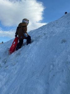目の前に広がる大きな雪山が…。登りたいのをぐっと我慢して、まずは、みんなでそり滑りをしました。